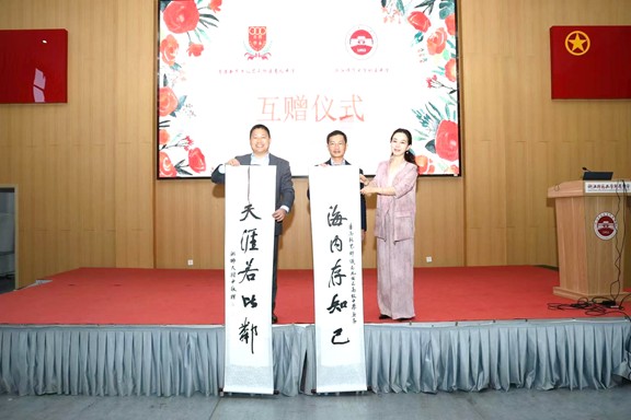 Secretary TONG Zhibin (left) from Jinhua High School Affiliated to Zhejiang Normal University exchanges souvenirs with Assistant Principal Mr LO Wai-yan (centre)