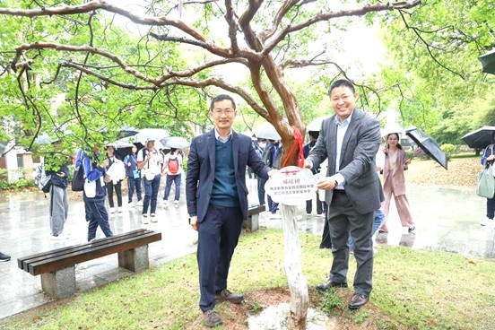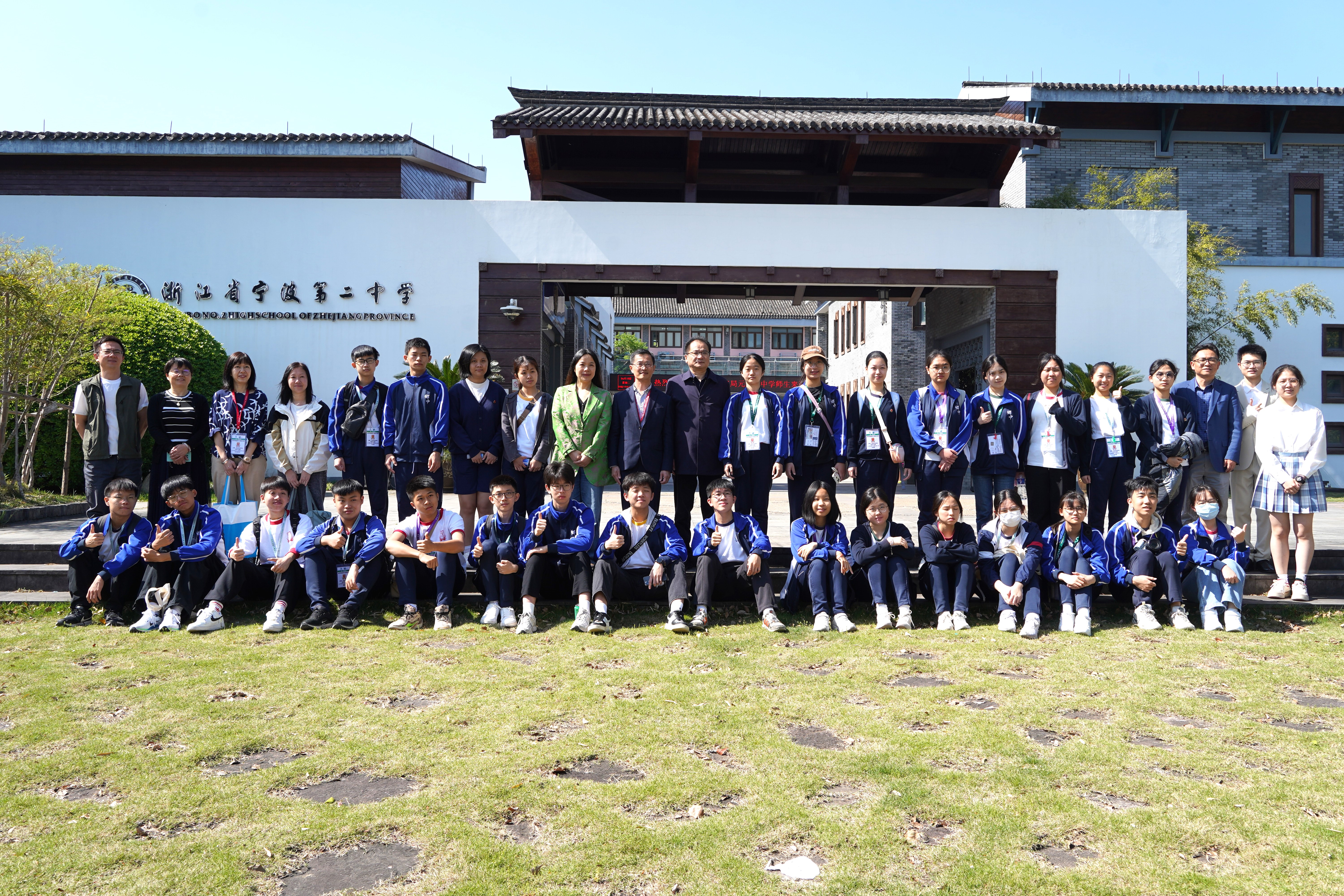 Our teachers and students take a group photo with the school leaders of Ningbo No. 2 High School on the school campus