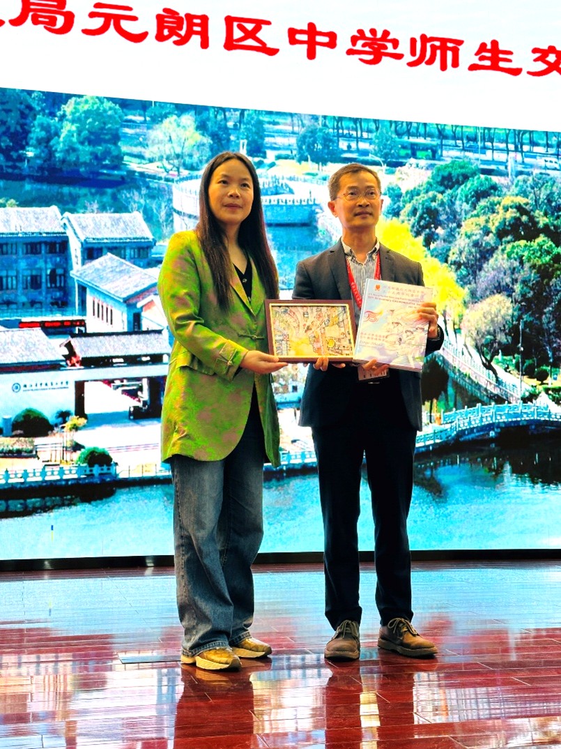 Secretary TONG Zhibin (left) from Jinhua High School Affiliated to Zhejiang Normal University exchanges souvenirs with Assistant Principal Mr LO Wai-yan (centre)